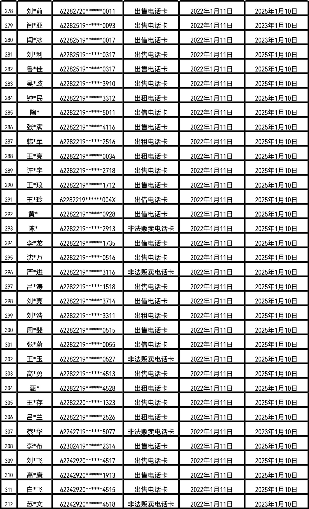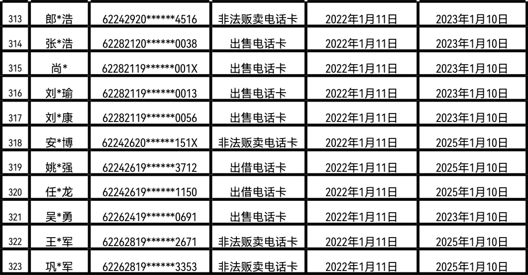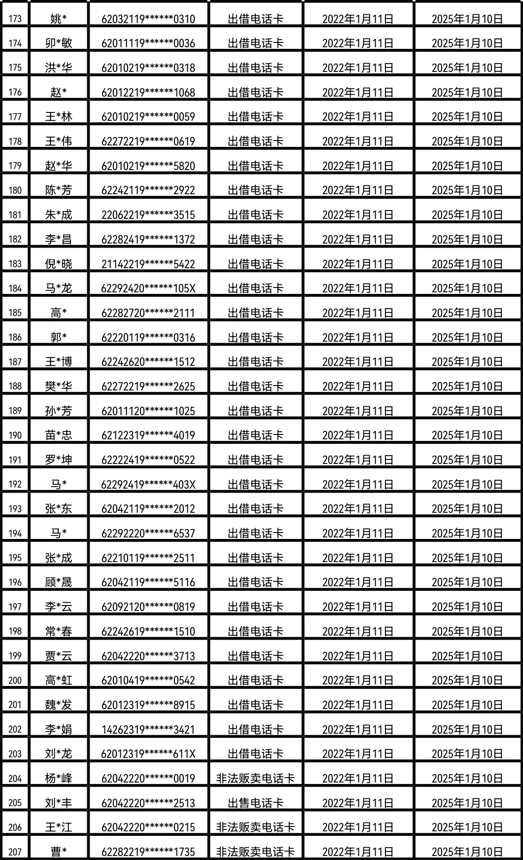 为严厉打击整治非法租借、买卖银行卡、电话卡等违规违法犯罪活动,从源头斩断“两卡”的利益链条,全力压缩电信诈骗灰黑产业生存空间,切实保障人民群众切身利益,1月12日,甘肃省打击治理电信网络新型违法犯罪工作联席会议办公室、甘肃省通信管理局联合公布第三批323名涉嫌电信网络诈骗电话用户,已于近日实施通信业务信用惩戒。