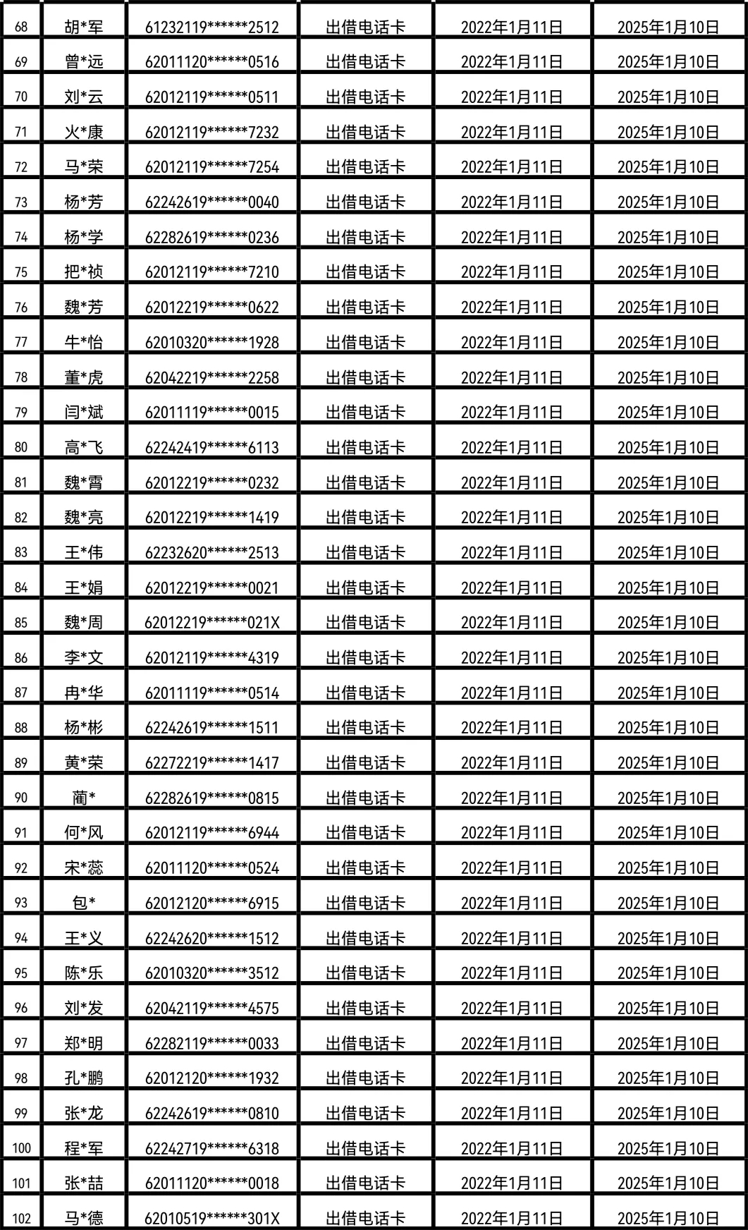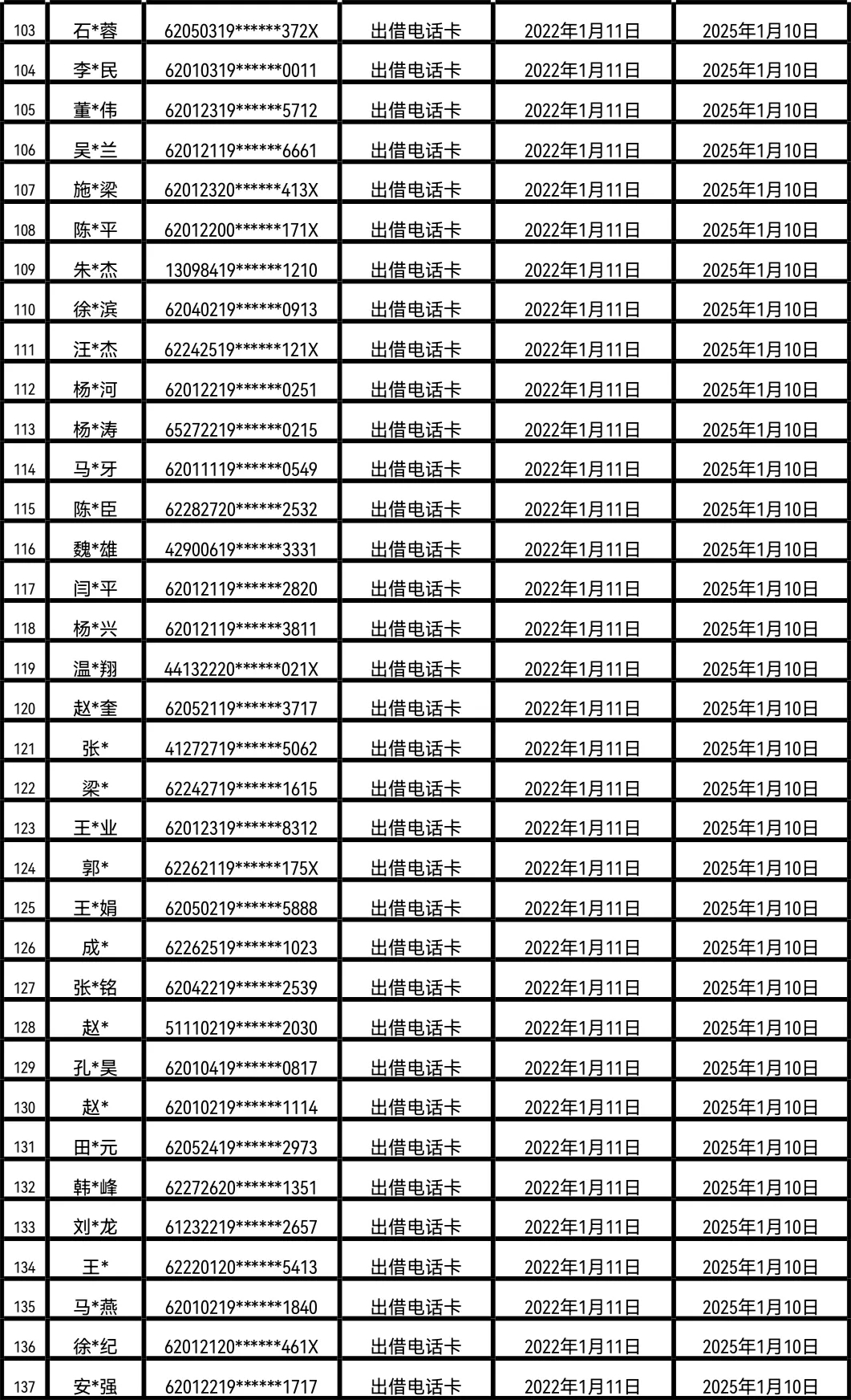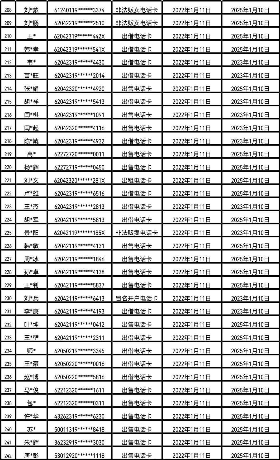 为严厉打击整治非法租借、买卖银行卡、电话卡等违规违法犯罪活动,从源头斩断“两卡”的利益链条,全力压缩电信诈骗灰黑产业生存空间,切实保障人民群众切身利益,1月12日,甘肃省打击治理电信网络新型违法犯罪工作联席会议办公室、甘肃省通信管理局联合公布第三批323名涉嫌电信网络诈骗电话用户,已于近日实施通信业务信用惩戒。