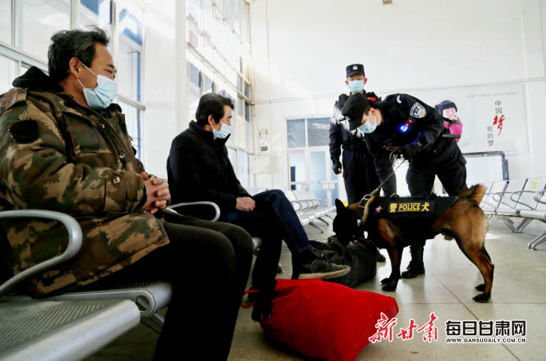 1月14日,甘肃省平凉市公安局崆峒分局特巡警大队队员带着警犬在车站开展春运前的安全巡逻。