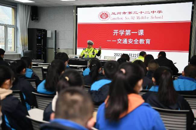 当天,东岗交警大队五中队中队长王元生走进兰州市第三十二中学,结合春季道路交通安全特点、辖区实际情况以及学生群体的特殊性,以图文与典型交通事故案例视频相结合的方式,向师生讲解了春季出行应知应会的交通安全知识,提醒大家自觉摒弃交通陋习,不闯红灯,不在公路上追逐打闹。倡议师生积极投入交通安全宣传,做家人的交通安全监督员,将交通安全常识传递给身边的每一个人,共同营造安全、畅通、文明、和谐的道路交通环境!