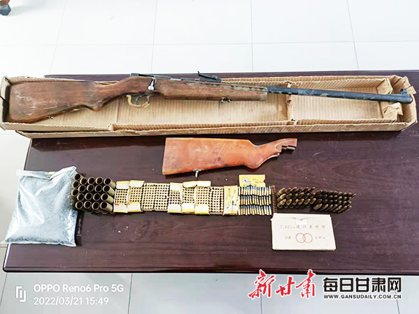 每日甘肃网法治频道讯 3月21日,白银市平川区社区民警与网格员入户宣传过程中,辖区群众周某向民警反映,在清理其父亲遗物过程中发现枪支一把,子弹若干。民警当即向所内领导汇报并对周某父亲住所及遗物进行了地毯式排查,共发现运动步枪一把,枪托一把,火药一包(约1155克),猎枪弹壳19枚,子弹540枚。民警细心整理后,将收缴的枪支弹药全部上缴分局治安大队。