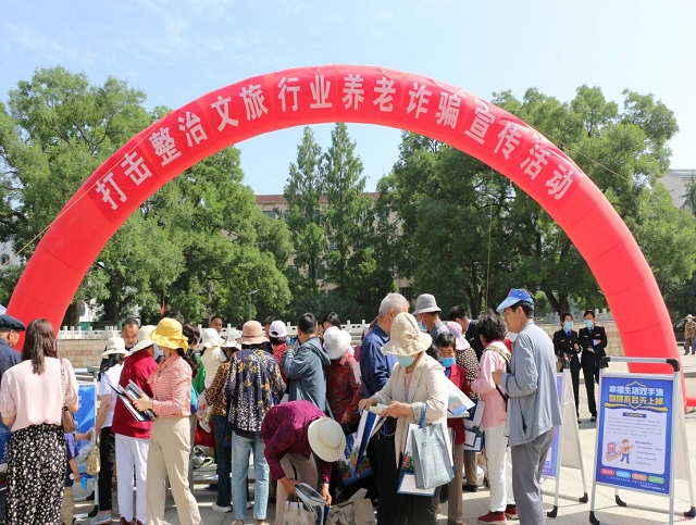 为进一步提高人民群众的反诈意识,为广大老年人安享幸福晚年保驾护航,2022年6月10日,平凉市文旅局联合文化旅游执法部门、崆峒区文旅局在人民广场举办了打击整治文旅行业养老诈骗宣传教育活动。