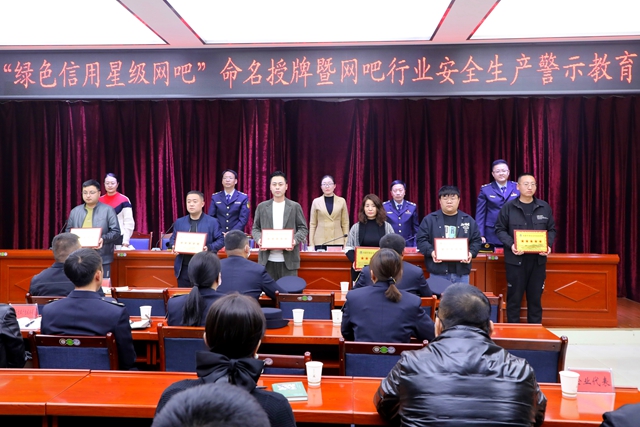 会上,为获得“绿色信用星级网吧”星级命名的互联网上网服务营业场所经营单位颁发了星级奖牌。