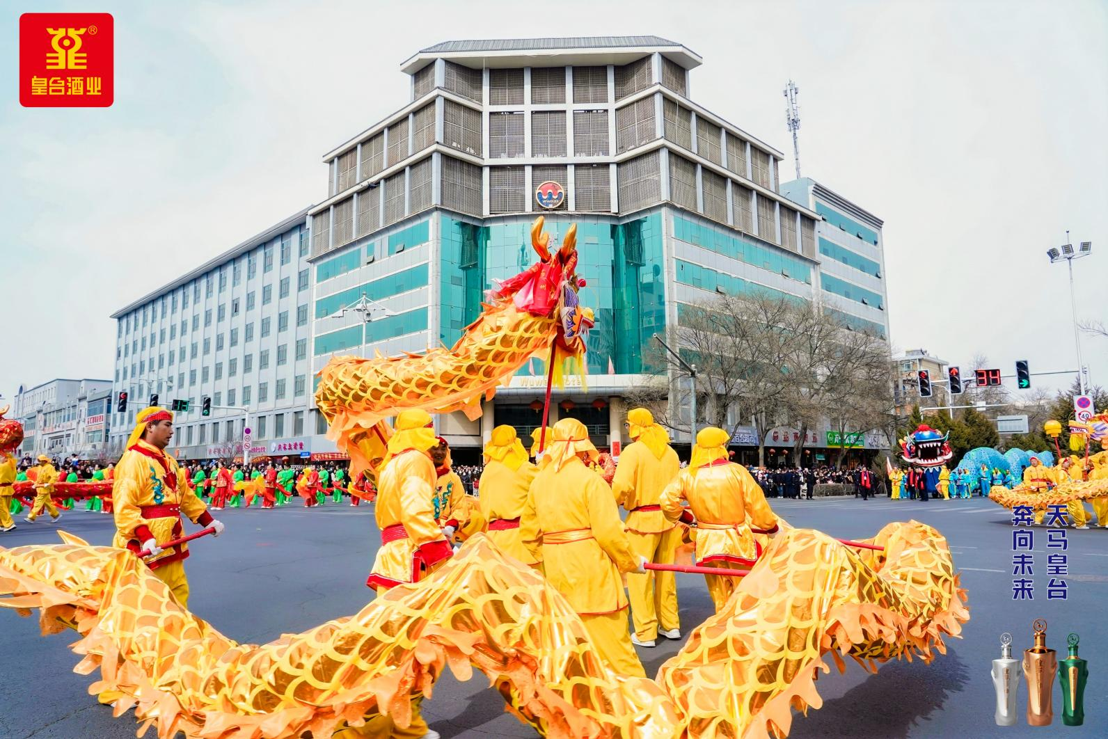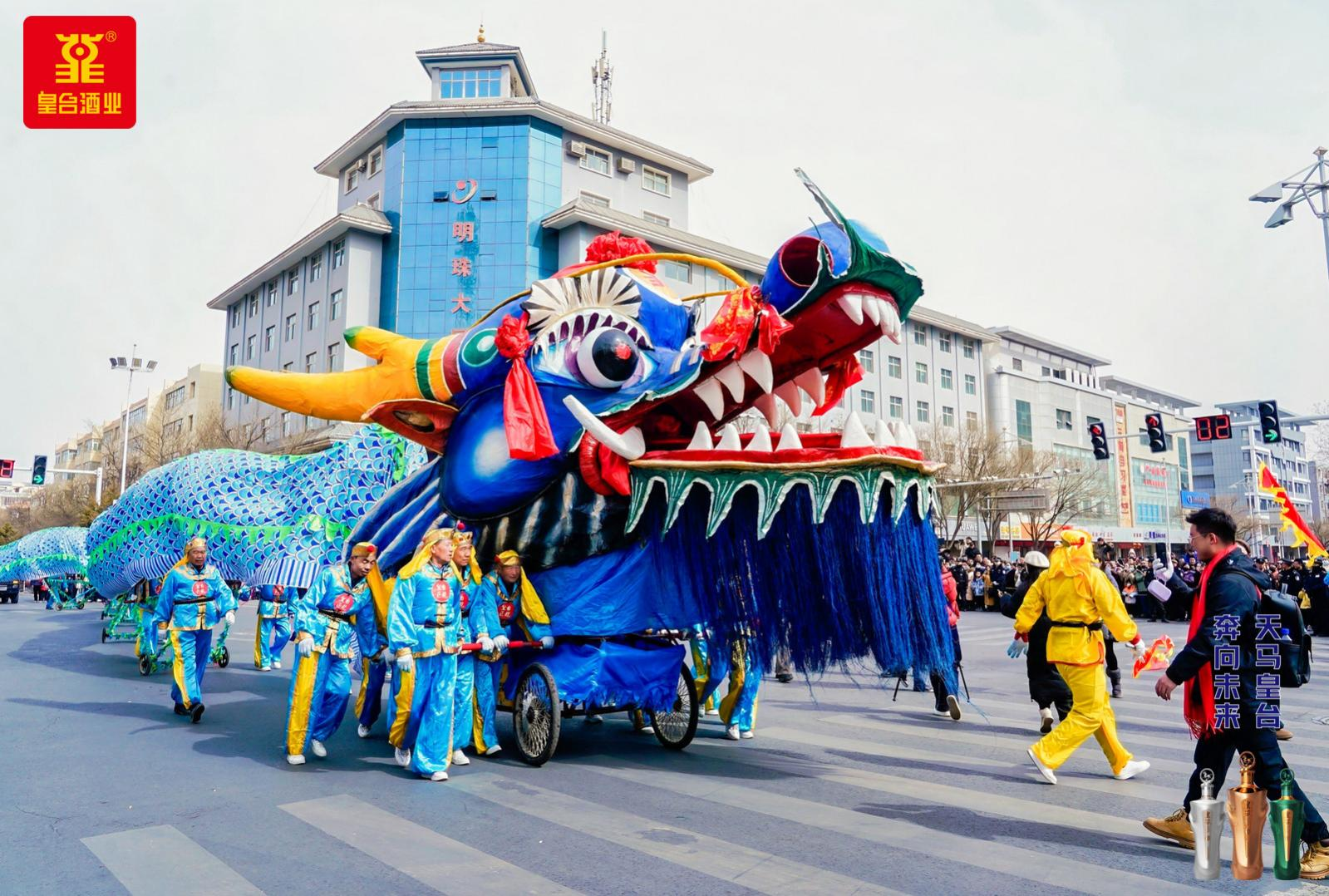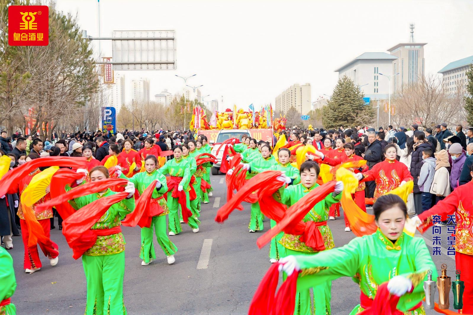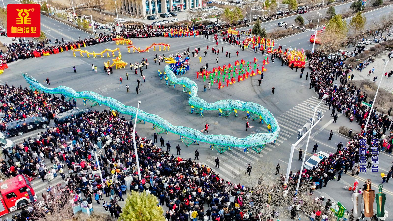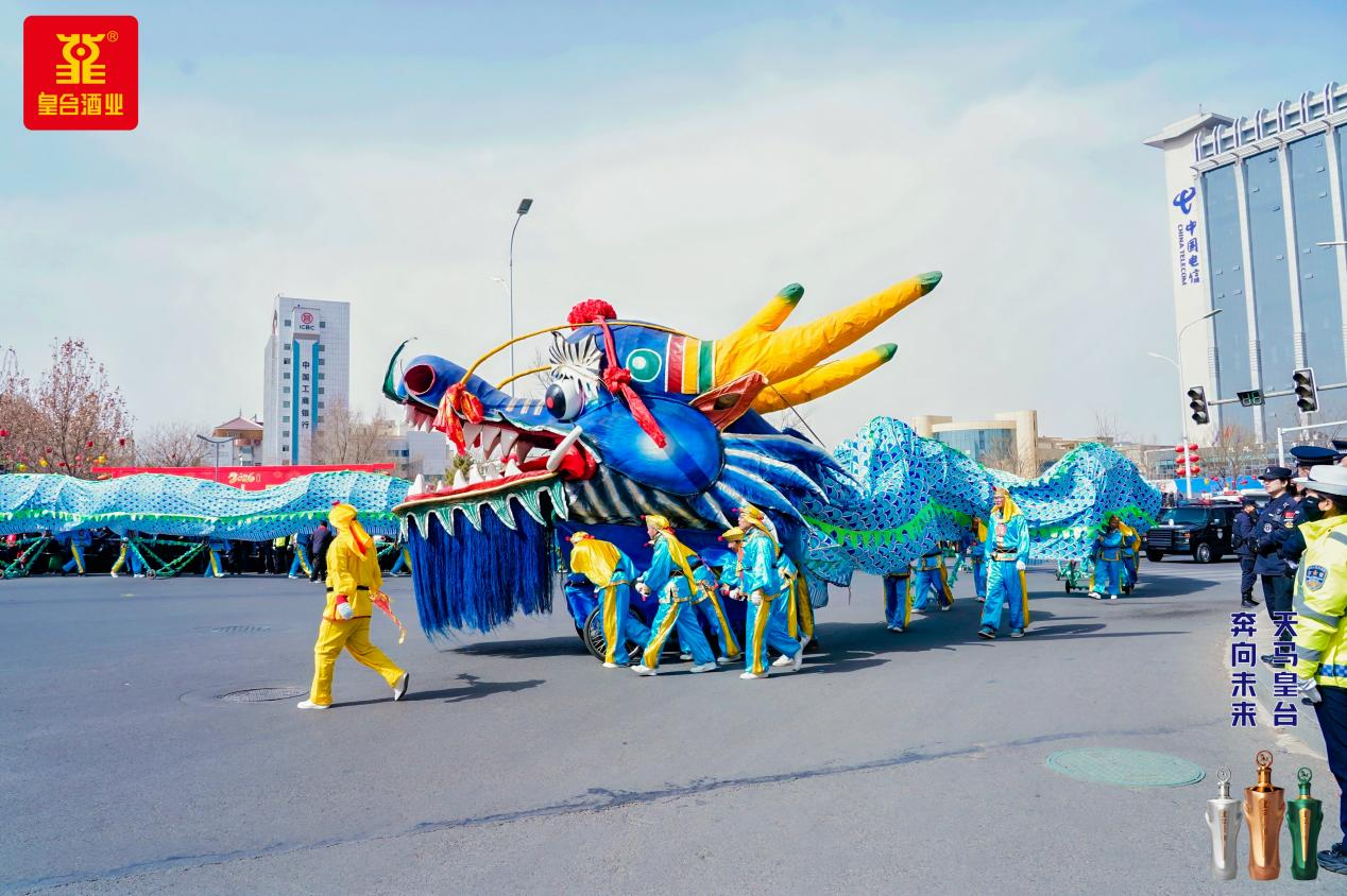 皇台酒业作为凉州区社火展演12支队伍唯一的企业代表,压轴亮相城区展演。作为压轴队伍,皇台方队一亮相便点燃现场热情,成为全场焦点。展演中,最瞩目的就是皇台巨龙,身披湖蓝华裳,威风八面,龙身长达99.99米,寓意皇台之酒,酒海不干。行进间,皇台巨龙气势如虹、颔首摆尾,琼浆自龙口一路飞洒——醇冽的皇台酒气氤氲升腾,弥漫在观看社火的人山人海间,醉美了整个凉州城,引得欢呼声、喝彩声此起彼伏。
