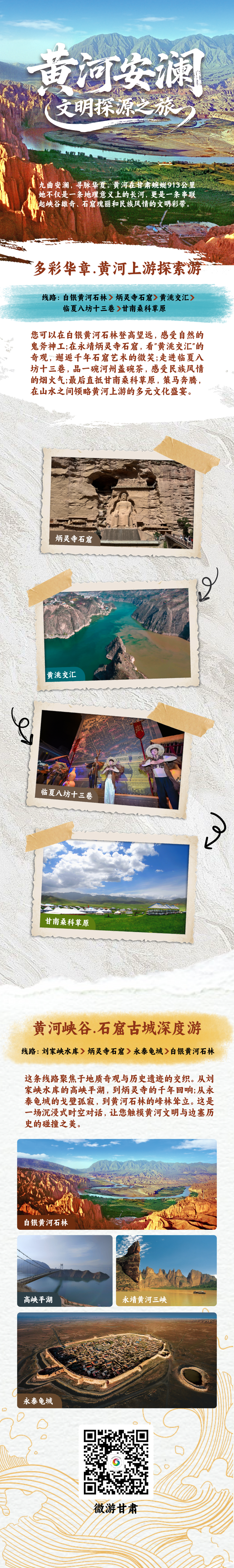 黄河安澜·文明探源之旅:沿黄河甘肃段一路前行,串联黄河石林、炳灵寺石窟、临夏八坊十三巷、甘南桑科草原等景点,完整展现黄河文明绵延传承的厚重脉络。