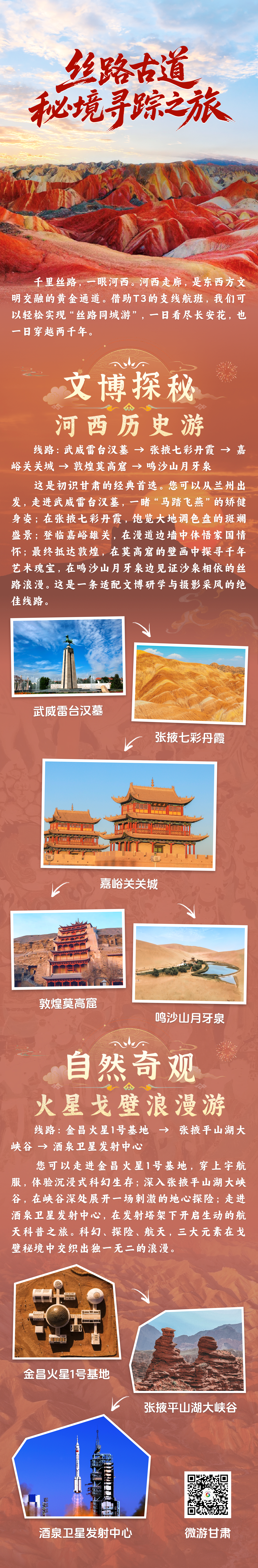 丝路古道·秘境寻踪之旅:深耕千年丝路文化底蕴,覆盖武威雷台汉墓、张掖七彩丹霞、嘉峪关关城、敦煌莫高窟等标志性丝路节点,带领游客穿越历史长河,沉浸式感受东西方文明交融碰撞的独特神韵。
