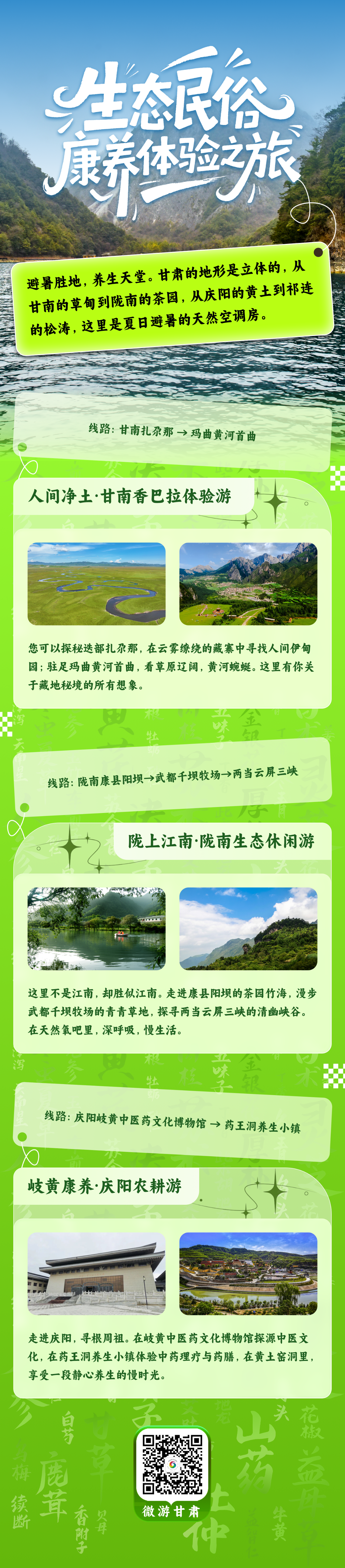 生态民俗·康养体验之旅:聚焦甘南扎尕那的原生态秘境、陇南秀美山水与庆阳特色中医药康养资源,打造集生态休闲、康养度假、民俗体验于一体的沉浸式出游产品,勾勒“人间净土”的诗意慢生活。
