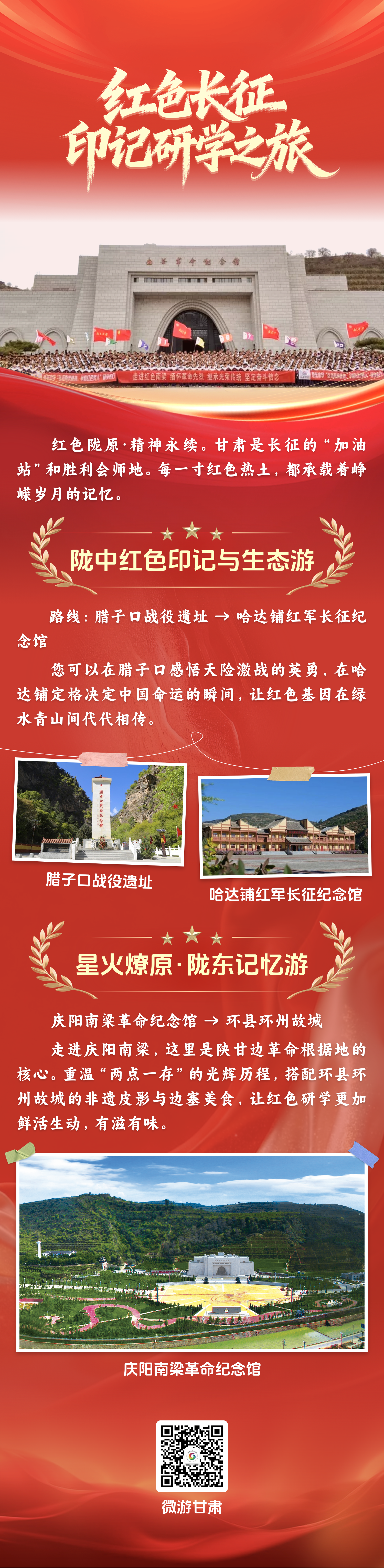 红色长征·印记研学之旅:以腊子口战役遗址、南梁革命纪念馆等红色地标为核心,将绿水青山与红色基因深度结合,让游客在行走中感悟长征精神。