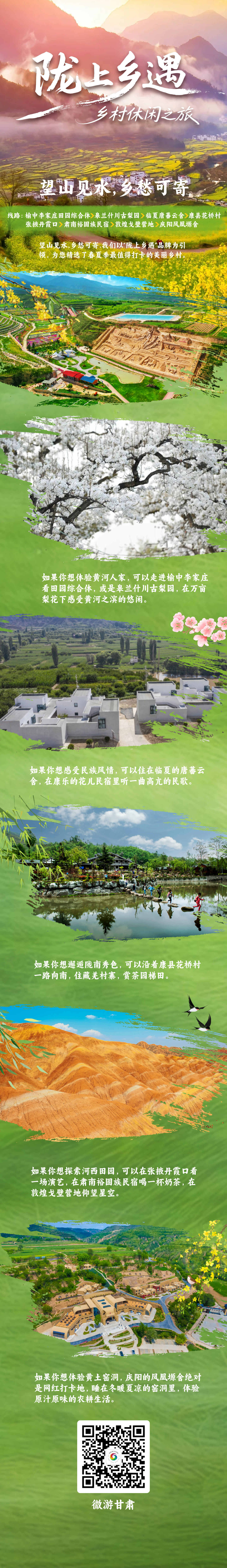 陇上乡遇·乡村休闲之旅:深度挖掘黄河人家、特色民族村寨、田园村落等乡土资源,推出农耕体验、民俗展演、田园度假等多元产品,满足游客亲近自然、乐享乡野的出游需求。