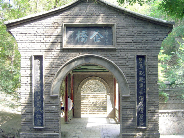 企桥,位于五泉山西龙口,民国八年(1919年)刘尔炘创建。桥体下方用块石砌筑拱券涵洞,桥面建连廊3楹,柱间装置栏杆,桥端青砖墙面开设券门。西端门外题额“企桥”,两侧嵌有刘尔炘题写的楹联:“想过去么,过去便能通碧落;休下来了,下来难免入红尘”。