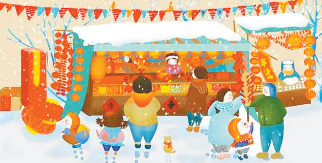 男孩子爱鞭炮,女孩子爱漂亮。小女孩们都很喜欢年集上那种在领口、口袋边上加有花边的新衣服,花边虽只是一种杂色的布条,但却使整件衣服看起来更洋气大方。年集的杂货铺里也有女孩子的美丽梦想。那里总有一种戴在头上的小花,纸做的,颜色以大红为主,偶尔也有黄色的,花瓣层层叠叠,而且有蝴蝶触角样的须,用胶粘在铁丝上,虽简单却也精致。这是女孩子春节必备的装饰品,大年初一那天,几乎每个女孩子头上、发辫上都有这种小花,几个小脑袋凑在一块,倒像个鲜花盛开的小花园。