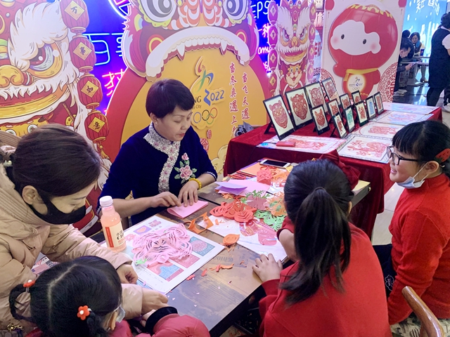 本次新春系列活动中,大年初一,邀请到甘肃剪纸非遗传承人现场展示甘肃剪纸技艺,讲述剪纸历史文化底蕴,介绍不同作品背后的故事,也为当天前来电影院观影的观众剪窗花、剪生肖,以及创作带有北京冬奥会元素的剪纸作品。剪纸作品惟妙惟肖,深受在场观众的喜爱。
