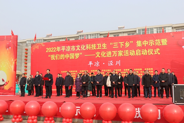 根据平凉市委宣传部《关于印发<2022年平凉市文化科技卫生“三下乡”集中示范暨“我们的中国梦”——文化进万家活动启动仪式工作方案>的通知》精神,2022年2月16日,平凉市文化科技卫生“三下乡”集中示范暨“我们的中国梦”——文化进万家活动启动仪式在泾川县回中广场举行,平凉市委常委、宣传部部长马琦,市人大常委会副地级领导樊文浩,市政府副市长丁富强,市政协副主席马继军出席,市、县相关部门负责同志,市、县志愿者,省上驻平及市、县新闻媒体记者共计1500多人参加了启动仪式。