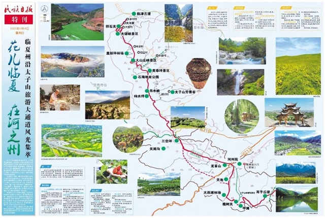 太子山沿线是临夏自然风光、人文景观的集萃地。近年来,州委州政府在打造临夏文旅百亿产业时,创新性地打造出“沿太子山旅游大通道”黄金线路。该线路全长286公里,南起莲花山、北至大河家,涵盖沿线康乐、和政、临夏、积石山4县的28 个乡镇、4个国有林场,已成为一条环临夏州旅游公路网线。
