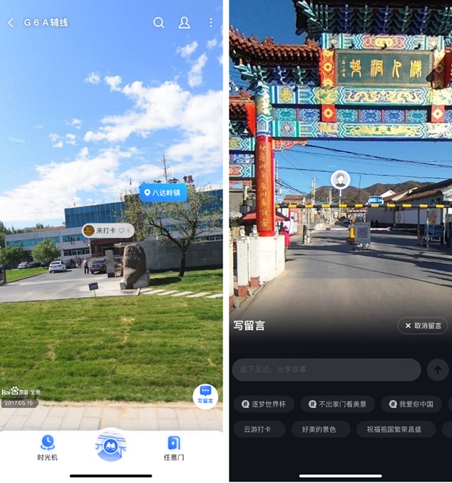 除了查询乡村旅游重点村镇,百度地图目前还支持查看全国200多个乡村旅游重点村镇全景。只需查询乡村旅游重点村镇后,点击进入全景页面便可浏览,直观了解乡村旅游目的地,360°沉浸式体验祖国的奇山秀水。在感受大美乡村同时,还能在全景中打卡留言,留下旅途中的点滴感悟,或为自己的家乡推荐代言。