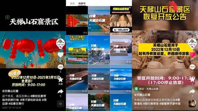 景区通过“冬趣春来,天梯直播聚人气”抖音直播活动,LED电子屏循环滚动播放、微信公众号、视频号、快手等新媒体线上线下齐发力,全范围、多角度、深层次宣传天梯山石窟景区旅游业复苏活动。