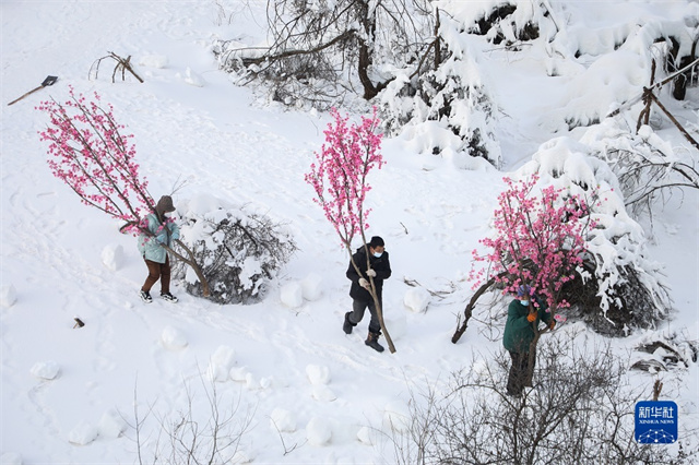 12月26日,在甘肃省渭源县天井峡(渭河东源)景区,工作人员搬运雪景装饰品。