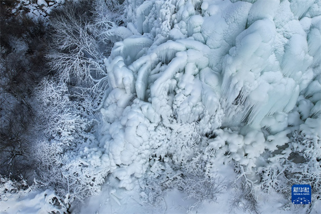 这是12月26日在甘肃省渭源县天井峡(渭河东源)景区拍摄的冰瀑和雪雕景观(无人机照片)。