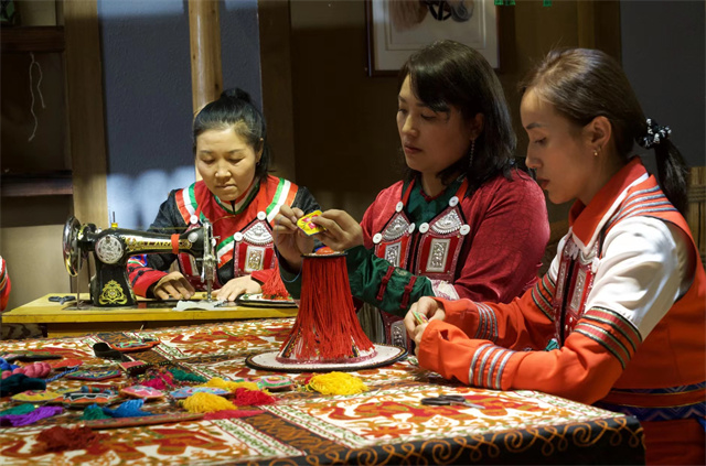 裕固族服饰非遗工坊依托萨尔玛非物质文化遗产发展有限责任公司生产车间、管理及设计研发平台、培训场所,统筹开展裕固族传统民族文化研究、设计研发非遗文创产品、延伸开展裕固族刺绣培训等工作。非遗工坊积极吸纳裕固族群众参加培训和生产,以四大项目研发和产业展示区建设为抓手,发展裕固族文化产业,打造裕固族文化品牌,讲述了裕固族非遗传承人渴望已久的故事。