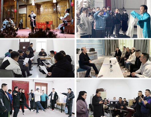 在学习现场,演员们还跟唱了《金钟响玉鼓催》《十月怀胎》《卖道袍》《九连珠》等道情经典唱段,老师们逐字逐句教,大家一字不落的反复跟唱,对地道的道情唱腔进行了精研细学,收获满满。同时,利用休息时间,《敦煌》剧组人员抓紧时间进行排练,进一步细细琢磨地道的陇剧唱腔。