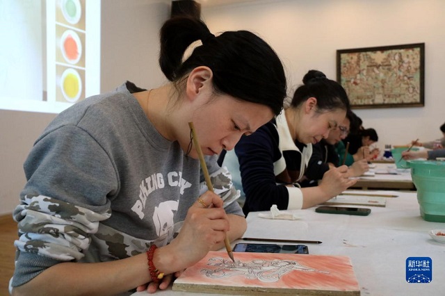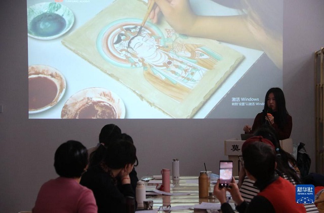 2月23日,在敦煌研究院莫高学堂,研学导师给学员讲授敦煌壁画临摹技法。新华社发(张晓亮摄)