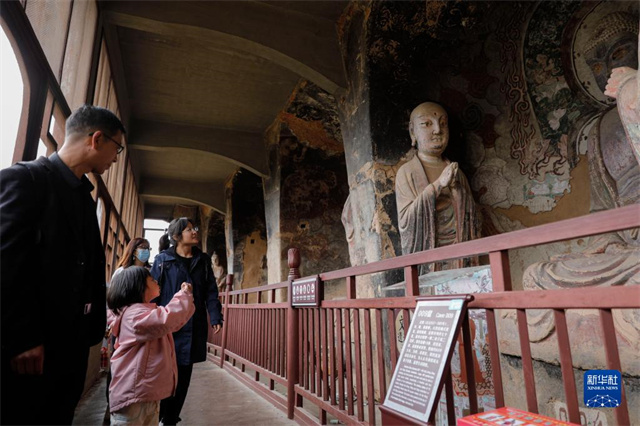 4月1日,游客在麦积山石窟参观。新华社记者 方欣 摄