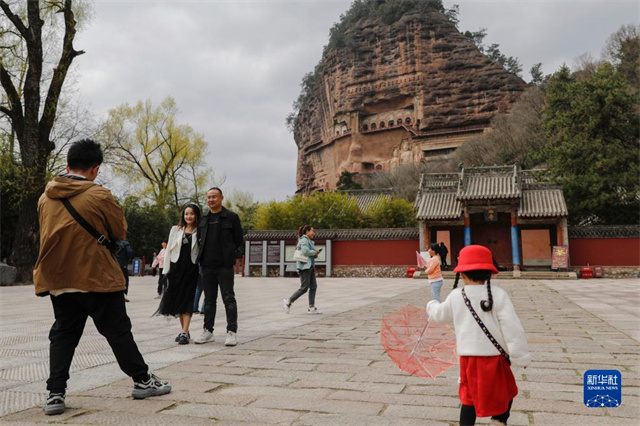 4月1日,游客在麦积山石窟游玩。新华社记者 王鹏宇 摄