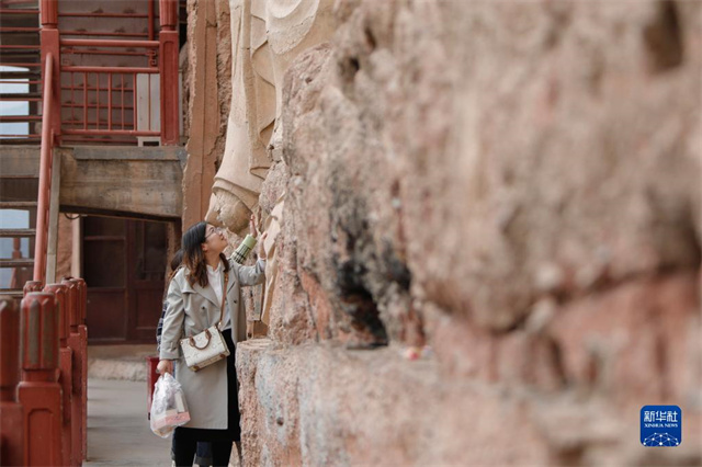 4月1日,游客在麦积山石窟拍照留念。新华社记者 李杰 摄