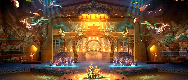 “乐动敦煌文旅产业综合体”是集历史文化、数字创意、沉浸演艺、特色市集、艺术文创为一体的甘肃省列重点文旅产业项目,将于今年5月正式运营。大型沉浸式旅游演艺剧《乐动敦煌》是省委宣传部策划、甘肃演艺集团创排出品的全球首部洞窟式沉浸体验剧,该剧溯源敦煌文化,借助现代技术对莫高窟壁画、古籍进行解读,以及敦煌古乐谱解译成果,用全息投影、3D威亚等高科技手段,以全沉浸式的呈现方式,演绎了西域少年追寻艺术的传奇故事,剧中运用了琵琶、排箫、阮等民族乐器及仿制敦煌古乐器的音色,通过胡旋舞、腰鼓舞、琵琶舞等典型舞蹈,展现了敦煌壁画中的乐舞盛景,全面展现敦煌传承千年的乐舞文化魅力。