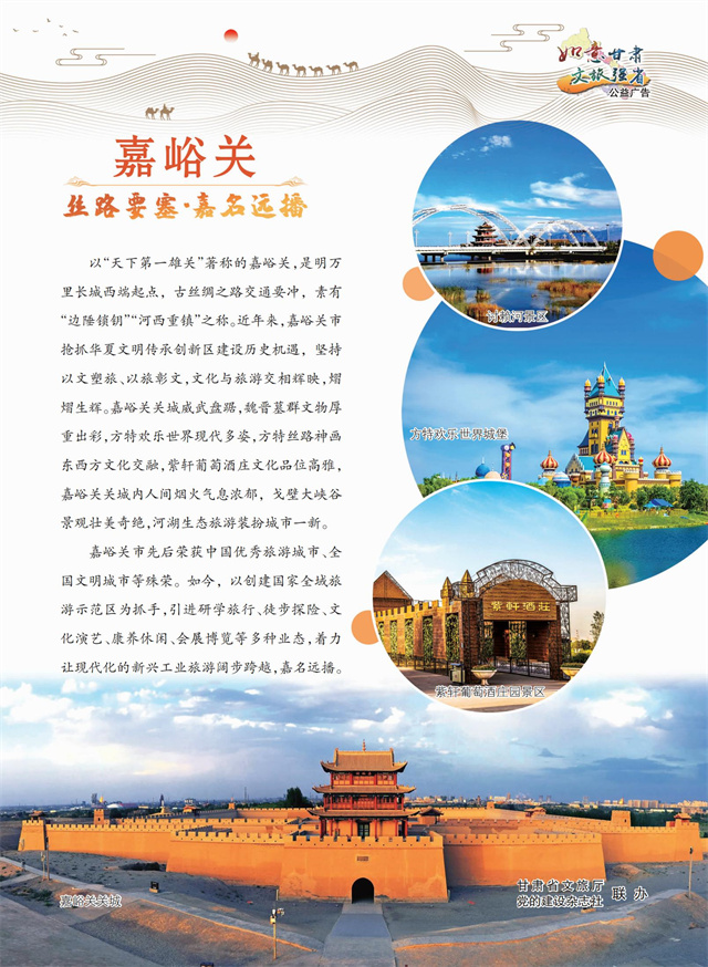 岁逢盛夏,万物葱茏。省文旅厅与省委《党的建设》杂志社打造的“党媒+文旅”宣传新窗口已推出第六期文旅宣传专版。精选河西走廊西端的嘉峪关市和陇之东南重镇的陇南市,从增强文化自信、展示旅游形象的角度,利用“如意甘肃·文旅强省”公益专栏,共同宣传甘肃城市文旅融合发展新成就,铺排文旅画卷,彰显文旅风采。