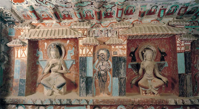 莫高窟第285窟营建于西魏,是莫高窟最早有纪年的洞窟,是一座“万神殿”。壁画中,有来自印度的飞天,有中国神话中的伏羲、女娲,有道教的朱雀、玄武。壁画中的日神形象,就有古希腊的太阳神阿波罗、佛教的日光菩萨、婆罗门教的太阳神等诸多解读。
