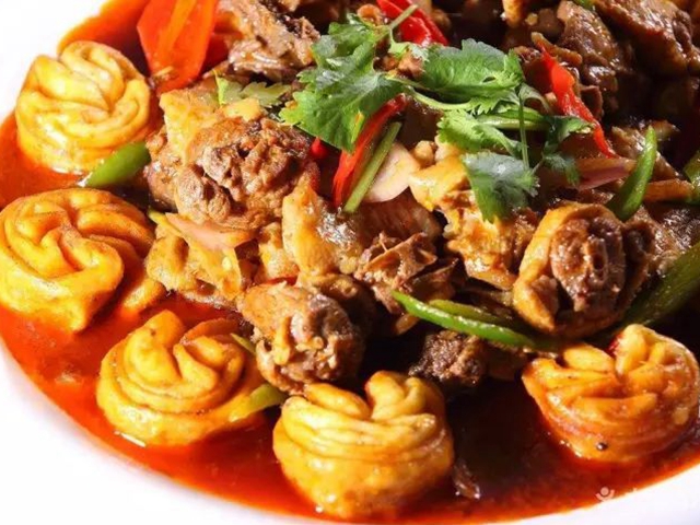鸡肉垫卷子,又名卷子鸡,是西北面食与菜肴的融合,和大盘鸡一样也是超级大份,是张掖特色美食中极具代表性的一道硬菜。以当地土鸡配以面卷炖制而成。调味的鸡肉汤是关键,这汤味道浓郁,锅里放油先爆炒,之后再加入很多种调味料,辣椒、姜粉、精盐等,直到鸡肉呈红色,再继续用小火焖烧。等到肉烂入味后,再把之前做好的面卷放入一起焖煮,筋道爽滑,到汤水干了就可以出锅了。无论是节日家人聚会,还是宴客招呼亲朋,卷子鸡都是张掖人餐桌上必不可少的一道特色名菜。这道菜的特点是酱香浓郁,面卷筋道有韧性,光看看品相就让人食欲大增,吃起来香浓有滋味。