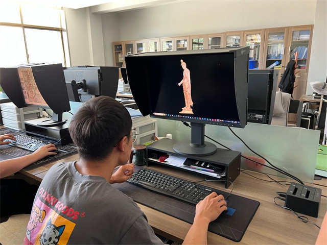 工作人员对彩塑进行三维重建。