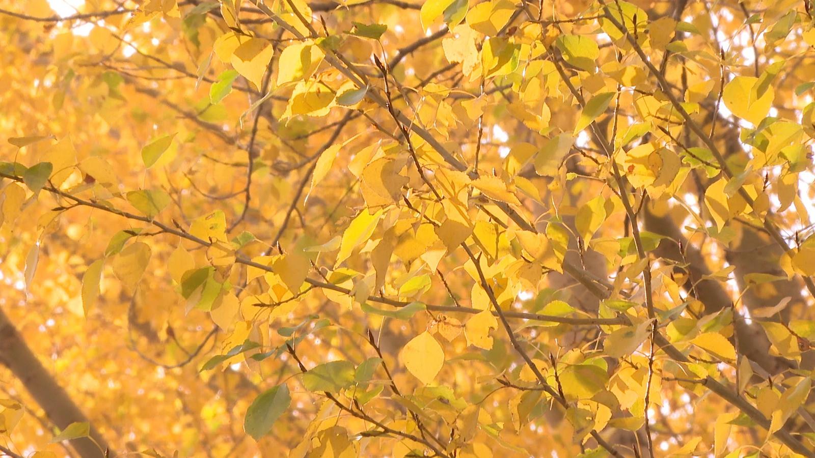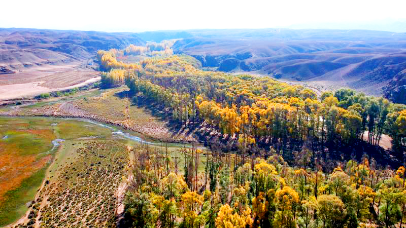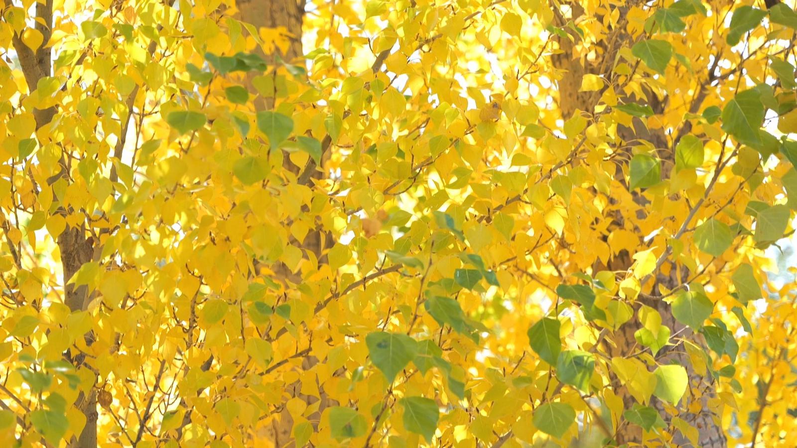 在红山窑镇月牙湖景区,大片的白杨树紧紧依偎着黛青色的山,青色、深黄色、淡黄色、黄绿色....树冠上的每一片叶子都有独属于自己的颜色,黄透的叶片金灿灿煞是好看,依旧翠绿的叶片焕发出倔强与生机,黄中带绿的叶片仿佛两个颜色的一场角逐,端看谁在这场博弈中占了上风。