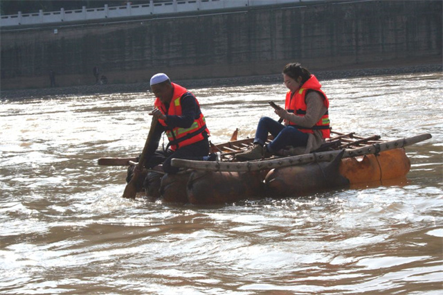 兰州市七里河区羊皮筏子非遗传承人马建华(左)在黄河兰州段摆渡游客(资料图片)。新华社发(兰州七里河区融媒体中心供图)