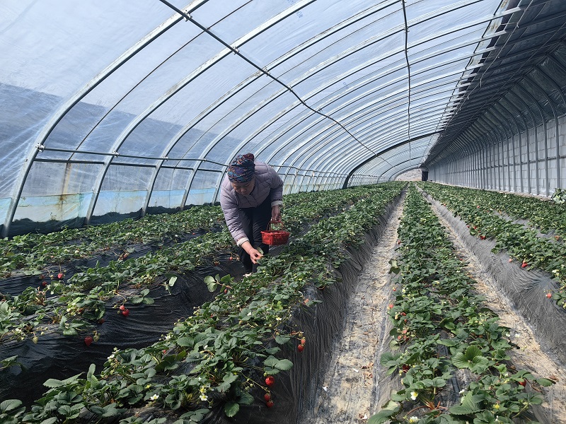 在园区的草莓大棚里,二茬草莓长势正旺,硕果累累,一盆盆刚采摘的草莓整齐摆放,香味扑鼻,种植户洪桃仙和丈夫正在抓紧采摘顾客预定的40多筐草莓,一筐筐草莓装车完毕,由丈夫送往县城客户手中……这样的工作洪桃仙和丈夫每天都在经历。