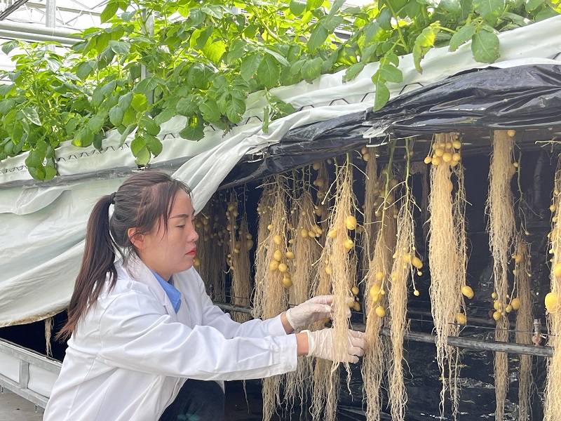 “马铃薯雾培法繁育技术是通过营养液定时喷雾的方式,使植株根系在黑暗和无基质条件下获得生长所需水分和养分完成其整个生育周期。平均单株结薯率可以达到40~50粒,是传统基质栽培1.5粒的20~30倍,这种方式不仅显著提高了马铃薯微型薯的生产效率,还避免了土传病害的问题。”庄浪县马铃薯脱毒种薯繁育中心主任周爱爱说。