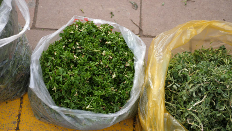 “主要卖的是苦苣、蒲公英、苜蓿、麻椒芽芽、地软、香椿,卖完下午就又到山上挖去了。这些菜都好得很,都很新鲜,人吃了对身体各方面都好得很。”早上七点就在摊点忙碌的杜永娟介绍道。