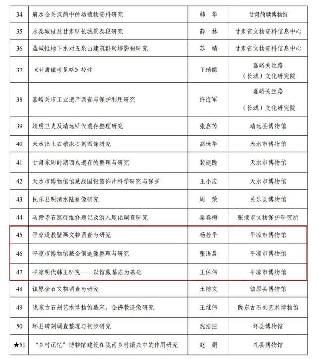 甘肃省文物保护科学和技术研究课题立项名单