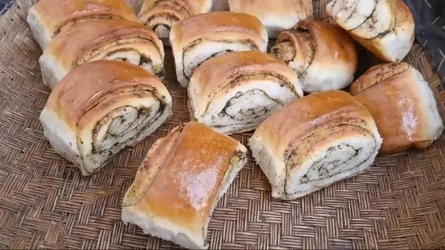 将面擀好,撒上胡麻盐,撒均匀,也可以按照自己口味适量多撒一层,然后把撒好胡麻盐的面卷起来,用刀从中间犁开,切成约七八厘米左右长的截截,两手从中间一翻,即可将之放在抹过油的烺(lǎng)板上面,盖在热炕上醒发约半小时,即可入烺坑,一个小时即可食用。