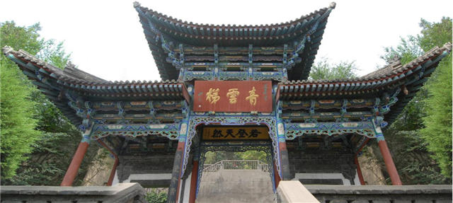 从万源阁两侧沿坡南上,高处即为青云梯(青云梯三字为书法家舒同题)。青云,意为这一段山路陡峭,游人直上青云,也有美好寓意,另挂有刘尔炘题额“若登天然”牌匾。背面额下挂有刘尔炘题联“高处何如低处好,下来还比上来难”,意为高处不一定就比低处好,得看你在位置上所作所为以及内心自我看法;从高处下来,需要一种豁达坦然。