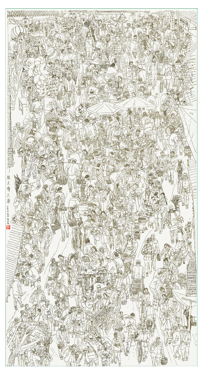 怎样将赶集的人物和场景画在一张图上,包括人物的动态?周新平说他想到并借鉴了北宋画家张择端的《清明上河图》中人物形象塑造理念,以及人物之间的组合关系。