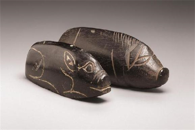 以长圆形炭精雕成卧猪,用线刻口唇、眉目、耳朵、四肢。炭精漆亮,刀法犀利遒劲,周身光滑,造型憨态可掬。