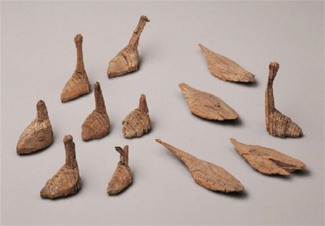 这组木鹅形态各不相同,有的向前伸颈,有的回头张望,身上用墨线绘出羽毛。造型简洁,生动逼真。