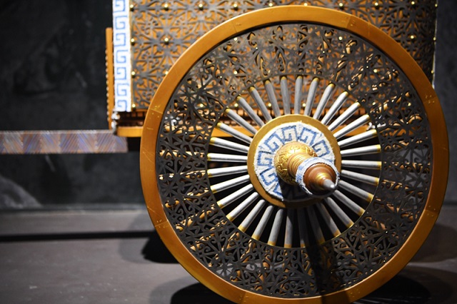 甘肃省文物考古研究所研究员谢焱每次遇到记者,总会说起他在马家塬遗址的考古发现,其中的得意之作,即是复原遗址出土的马车。这批出土马车结构清晰、纹样多变、装饰精美,属于礼仪性陪葬用车。车辆表面90%以上部位用金、银、铜、铁、锡等金属饰片、人工合成的料珠和髹漆彩绘图案进行装饰。其中一辆的精美程度震惊世人,被网友称为“先秦第一豪车”。