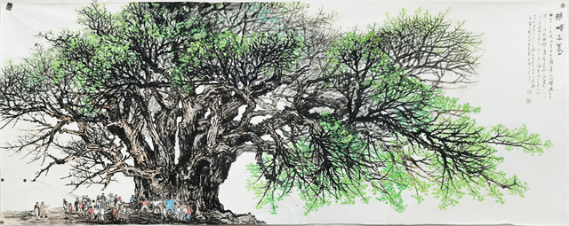 陇上古槐,气吞山河。秀而繁荫,芮鞫之兴。风华正茂,分荫万畦。水墨关,悠然放歌。