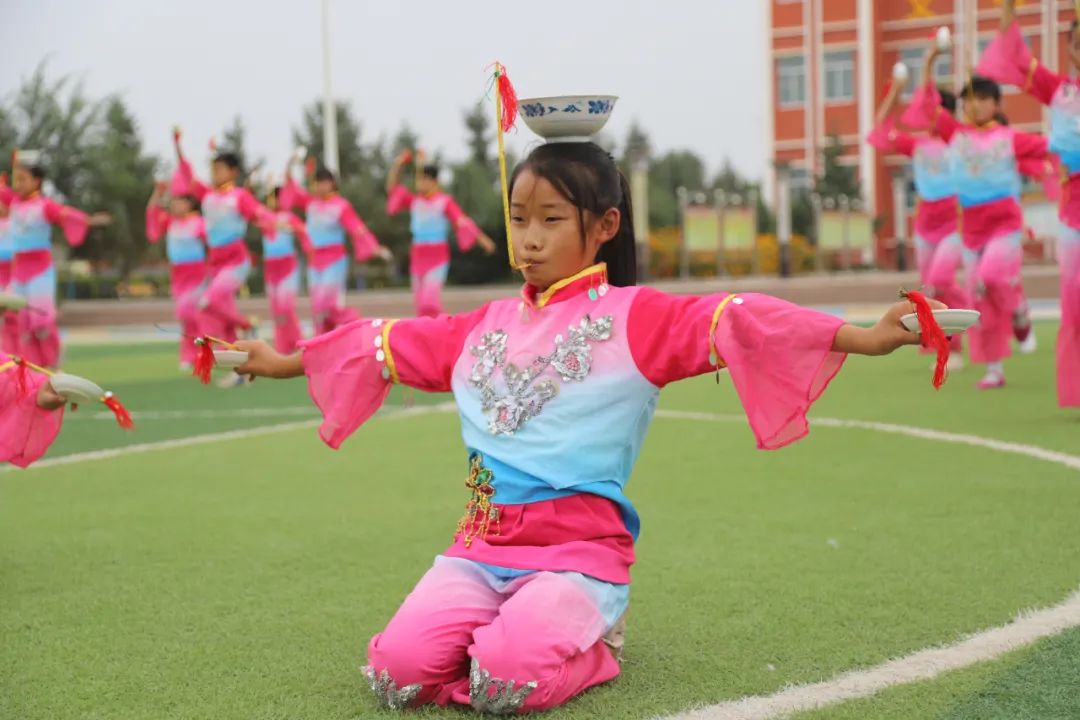 随着音乐响起,孩子们时而奔跳来回穿插,时而旋转如陀螺捻线,挥袖间如天女散花,张扬时似嫦娥奔月,可无论怎么活动,顶在她们头上的瓷碗还是静静地一动不动。