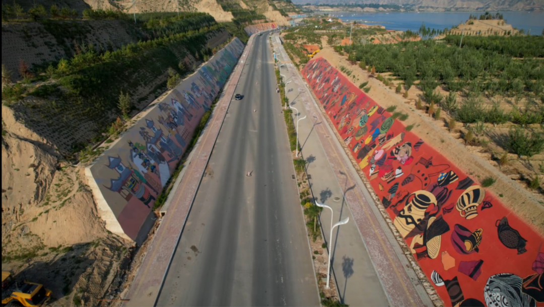 这片湖叫炳灵湖,是黄河上游最大的人工湖,是举世闻名的刘家峡水库;这条路是炳灵湖的环湖北路,是永靖县的又一条旅游观光路,也是当地群众的致富路;这幅长廊是环湖北路的黄河历史文化长廊,它描绘着永靖这片热土的沧海桑田、历史发展,讲述着黄河沿岸古老的岸谷之变……
