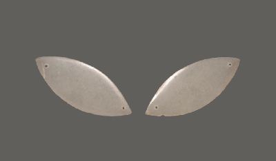 玉质光润,呈椭圆形叶片状,两端各钻一孔,钻孔为单面钻。此为贵族墓葬中缀于玉覆面上压眼的葬玉。
