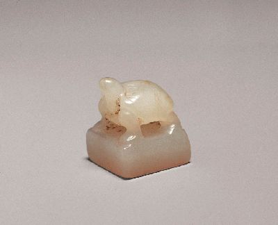 为优质和田玉,印面白文篆文“杜宝”二字。圆雕龟钮,印台较厚。字体布局匀称,章法、姿态、刀工均达到炉火纯青的地步。